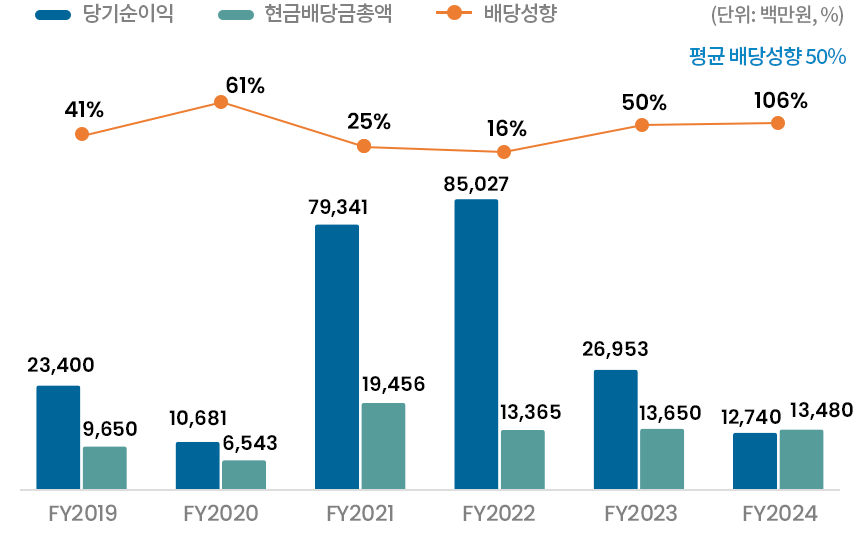 당사는 2019년 유가증권시장 상장 이후 매년 50~150억의 현금배당을 지속적으로 실시하였으며, 주당 100원의 최소배당금을 도입하여 배당의 안정성과 예측가능성을 높이고자 합니다.