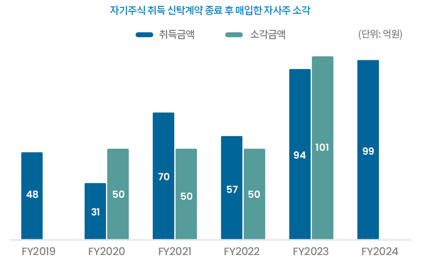 당사는 상장이후 주주환원을 위해 매년 현금배당과 자기주식취득을 실행하여 왔으며, 연간 100~250억 수준의 주주환원을 실천하고 있습니다.